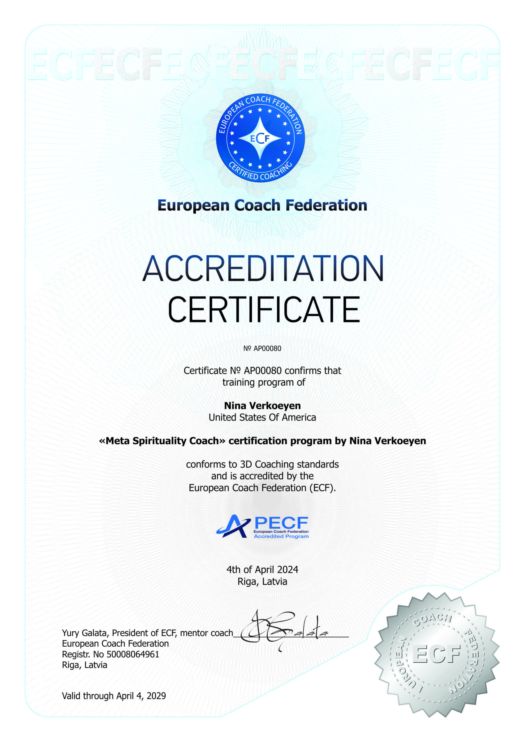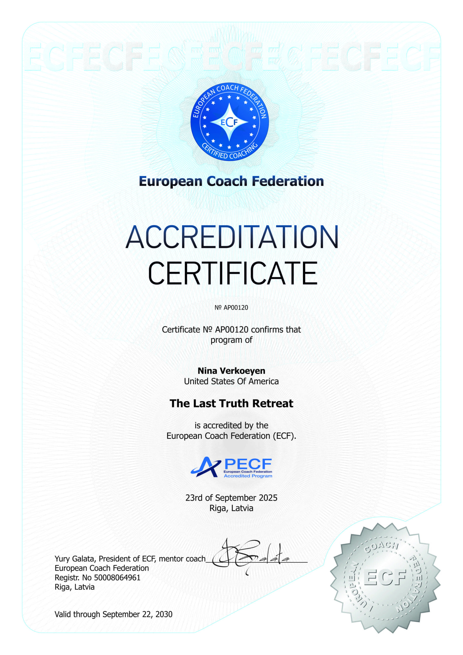 22. Programma: Spiritual coach certification program by Nina Verkoeyen Atbildīgā persona: Nina Verkoeyen Valsts: USA